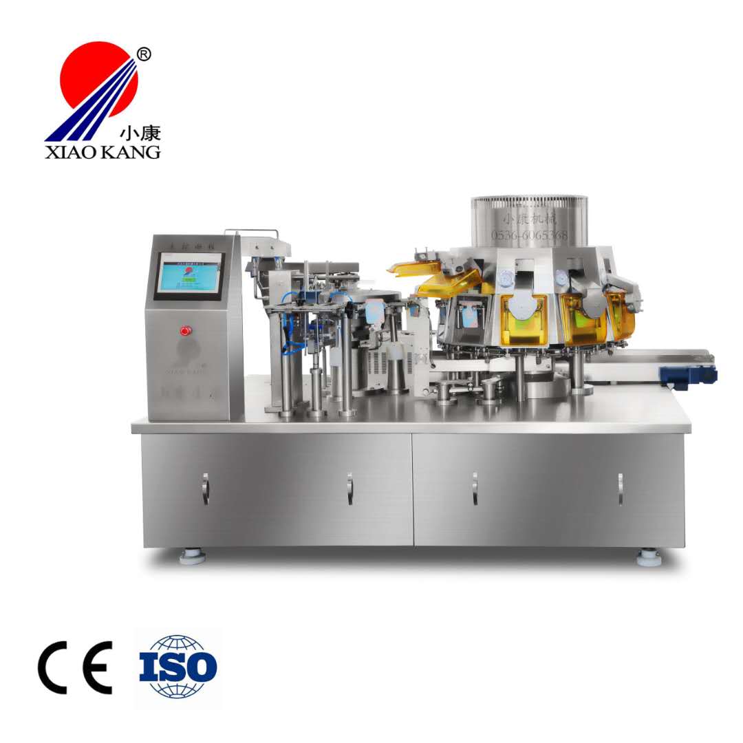 給袋式真空包裝機之中的給袋填充旋轉系統主要是由304不銹鋼加工件、件、精鑄304不銹鋼部件、高精度軸承、進口塑料軸承、進口工程塑料滾輪等符合食品包裝衛生標準的材料加工、裝配而成,這可以很好的保證產品的安全衛生,延長設備的使用壽命;其真空封口系統轉盤材料為精鑄鋁加工,真空室材料為鋁合加工件,真空蓋為高硬度工程塑料在滿足包裝機械衛生標準及安全強度前提下,降低了重量節約了電機功率;傳動系統使用一臺勻速恒扭矩變頻電機統一控制兩旋轉系統,從而實現準確、協調、高速的目的。還配備有控制系統、氣動元件、真空泵,根據需求還有預留工位等。